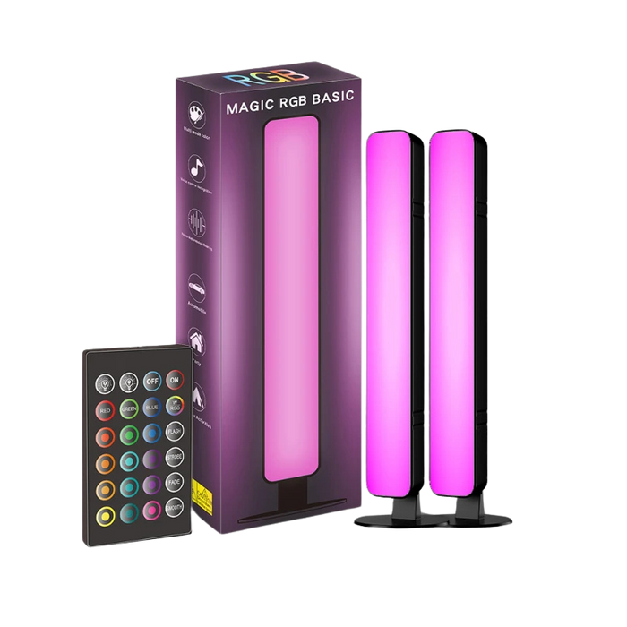 Durable ABS and PC construction with 14 LEDs per lamp (2 pieces) delivering vibrant RGB illumination. Powered by USB 5V/10W and controlled via music-sensing IR remote. Includes USB cable, 24-key remote, and English manual. Product size: 255×40×35 mm | Package size: 265×170×45 mm | Weight: 300 g | Color: Black